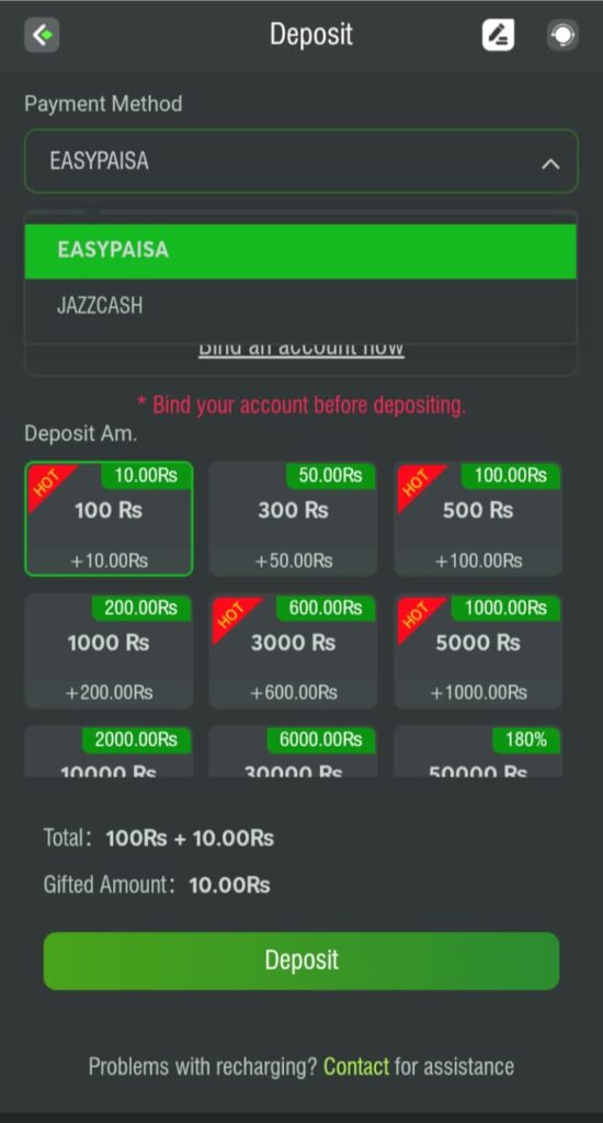 - Select Deposit, choose the amount, and pick your method: Easypaisa or JazzCash.