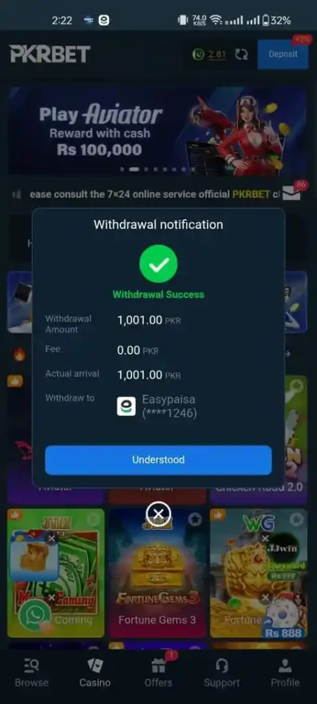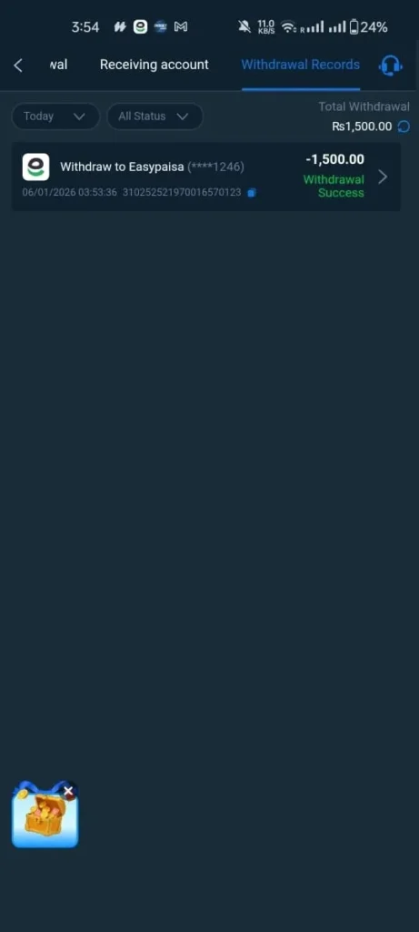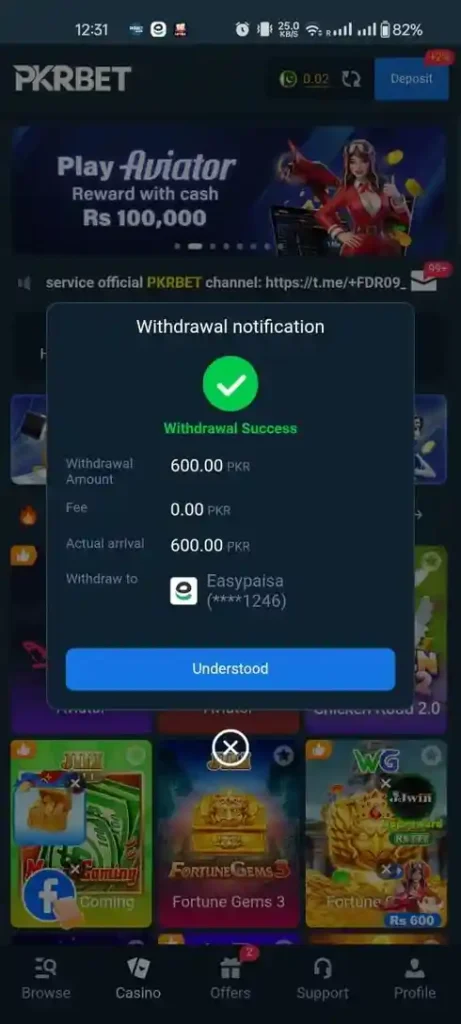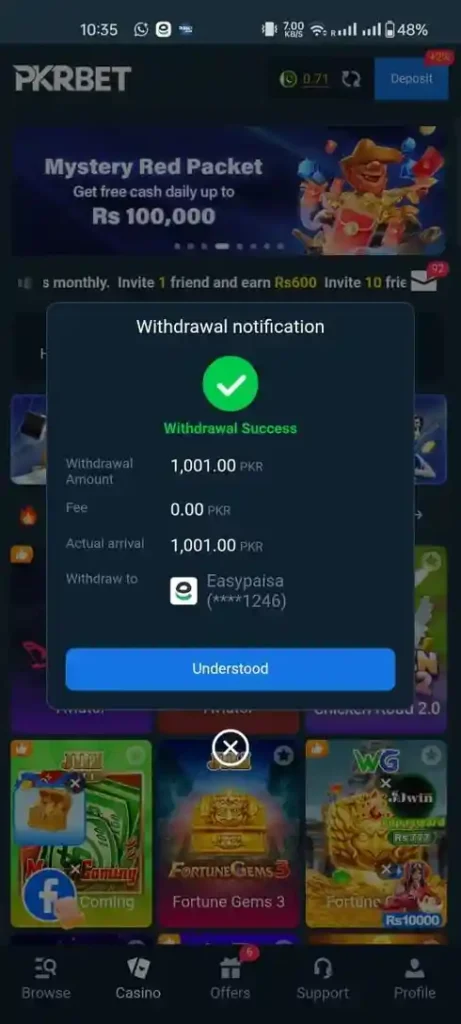 The system usually processes PKR Bet game withdrawals within 1 to 24 hours.